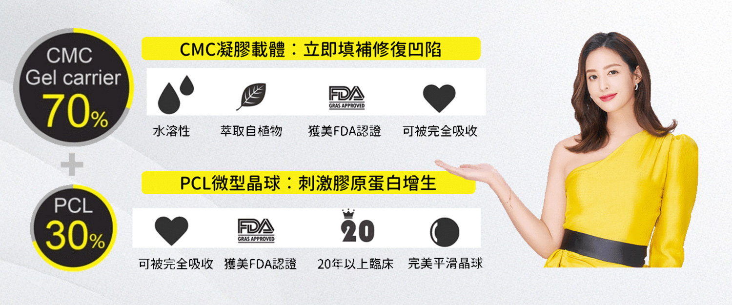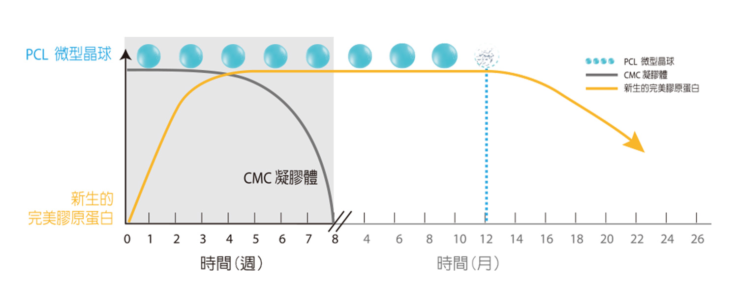 經由注射在凹陷部位的真皮層,PCL隨著CMC凝膠載體在注入皮下組織後,開始均勻分佈,CMC能提供適當的支撐力,填補肌膚的凹陷處,搭建出一個幫助自體膠原蛋白增生的固定支架;隨後PCL的微米大小及表面平滑的正圓形晶球特性,能刺激膠原蛋白新生,提供肌膚自身賦活動力,更能長效維持拉提緊實肌膚的線條。