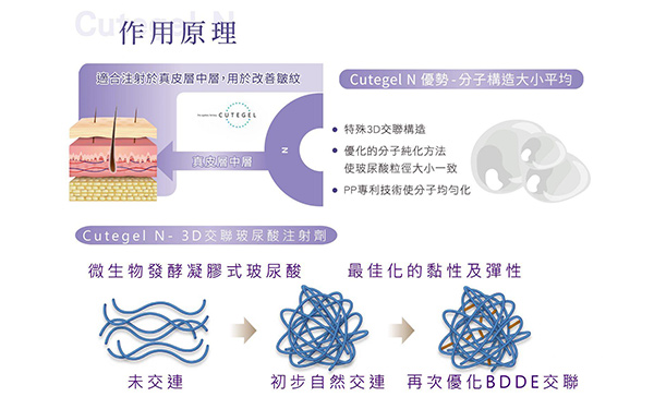 Cutegel N珂蒂婕玻尿酸 是一種以非動物性玻尿酸(HA)為主要成分的填充劑,因為他是非動物性玻尿酸,並沒有參雜其他生物的抗原,因此人體對他產生過敏反應的機率極低(低致敏性)再執行施做療程。
